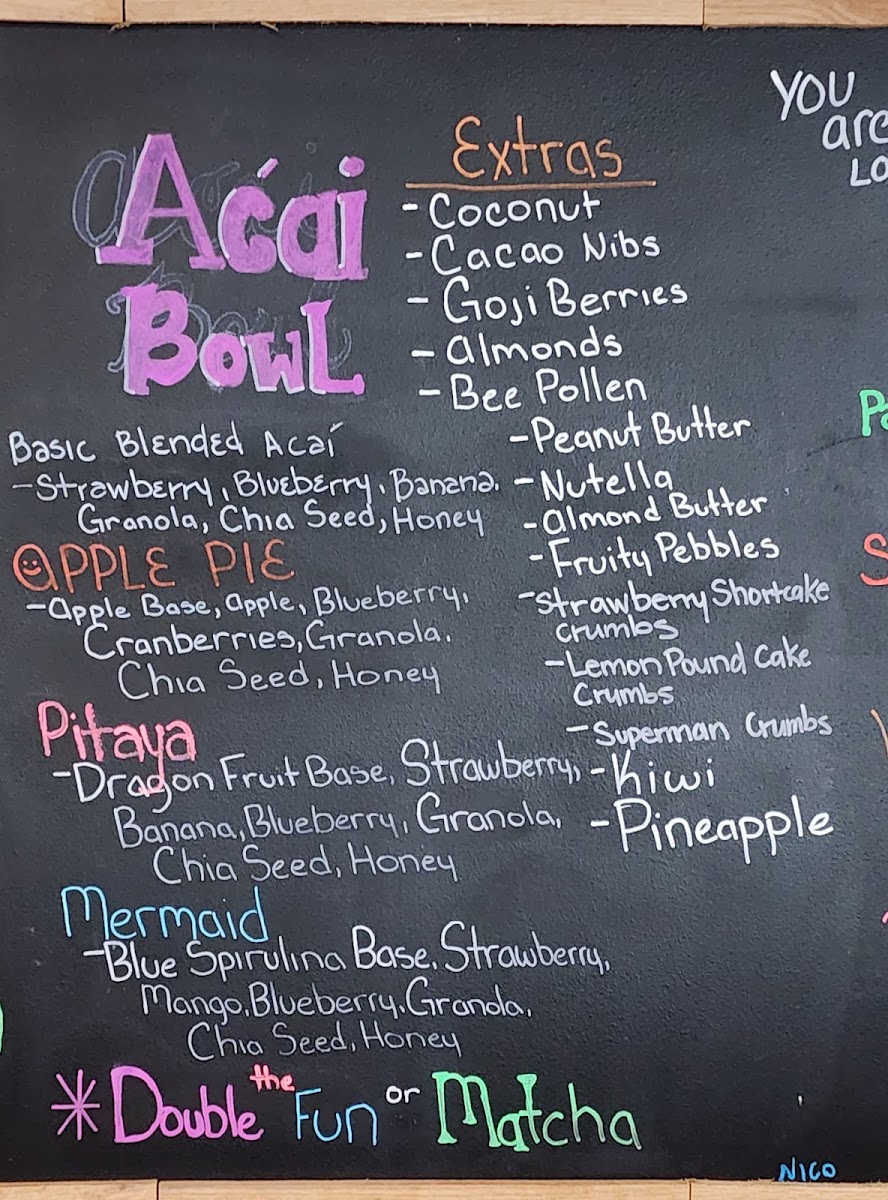 Acai blended base, Strawberry, blueberry, banana, granola, honey & chai seed. Additional items can be added at an additional charge.