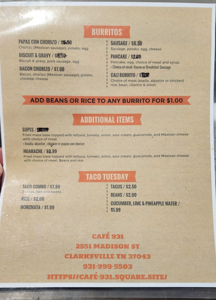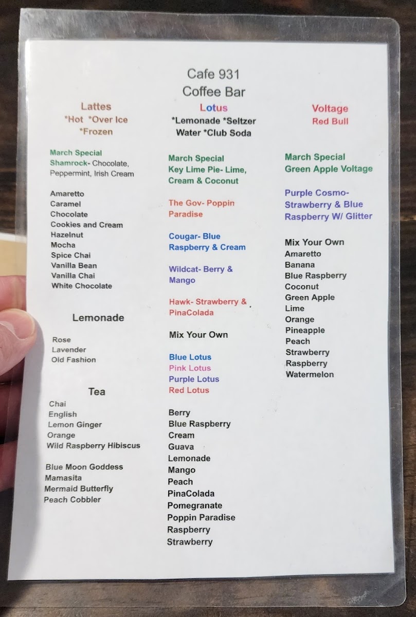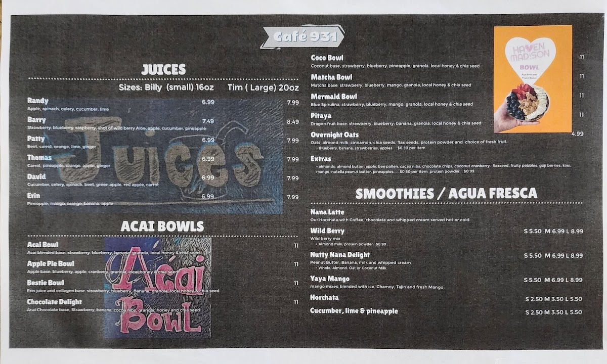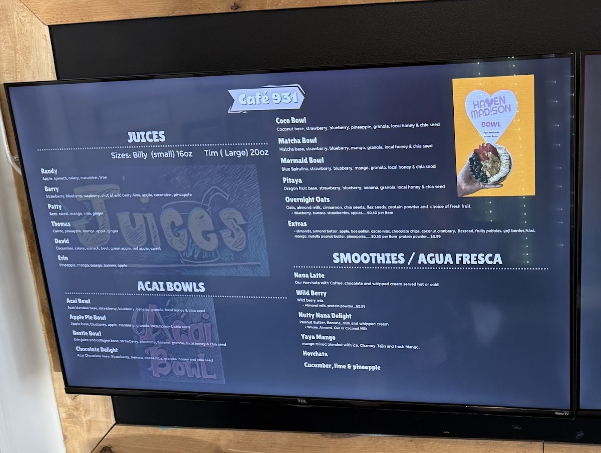 At Cafe 931 on Madison Street, the menu offers a vibrant mix of refreshing beverages, creative breakfast options, and indulgent treats that cater to a wide range of tastes. Smoothie enthusiasts can choose from selections like Mango Smoothie, Strawberry Smoothie, Nutty Nana Delight, Yaya Mango Smoothie, and Wild Berry Smoothie, while those looking for a fresh juice pick-me-up have options such as David Juice, Randy Juice, Thomas Juice, Erin Juice, and Barry Juice. The imaginative Lotus Drinks like Zombie Blood Lotus, The Gov, The Wildcat, Custom Lotus Drink, and The Hawk add a fun twist to the menu, complemented by energetic Redbull creations like Purple Cosmo, Zombie Blood Voltage, Electric Eel Voltage, Green Apple Voltage, and Redbull Voltage. Seasonal flair comes through in the Valentine Specials, including Cupid Bow, Cherry On Top, Strawberry Cheesecake Latte, Honey Rose Latte, and Pinky Promise. For savory cravings, the Daily Specials feature Quesabirra Taco Meal, Chips And Dip, Taco Meal, Quesabirra Taco, and Tacos, while breakfast options are hearty and inventive with Avocado Toast, Buttermilk Pancakes, Mexican French Toast, Create Your Own Breakfast, and Classic Breakfast. The beverage lineup is rounded out by refreshing choices like Passion Fruit Drink, Cucumber Water, and Jamaica, as well as coffee bar specialties including Shaken Lemonade, Shamrock Mocha W/Coffee, Cold Brew Coffee, Latte, and Nana Latte. Signature Tractor drinks like Lemonade, Strawberry Dragon Fruit, Hibiscus Mango, and the nutrient-rich Acai Bowl offerings-Overnight Oats, Acai Bowl, Haven Madison Bowl, Apple Pie Bowl, and Bestie Bowl-complete a menu that balances playful creativity with satisfying flavors. Every category is thoughtfully crafted, making Cafe 931 a destination where both familiar favorites and adventurous selections can be enjoyed in a lively, welcoming atmosphere.